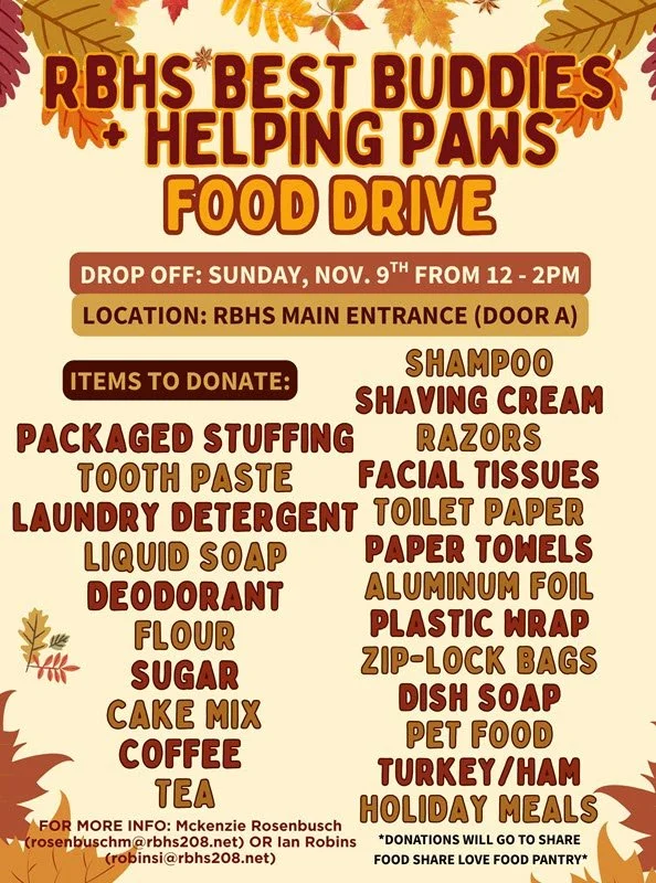 Best Buddies and Helping Paws will host their annual Food Drive on Sunday, November 9th, from 12-2 PM by the Main Entrance at RBHS (Door A). All donations will go to the Share Food Share Love Food Pantry. See above for suggested donation items. Thank you for your support!