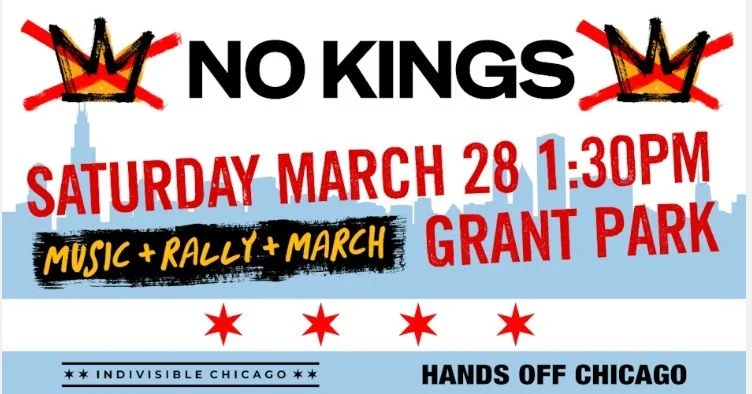 Stay Tuned- We are still working on details for a possible local event in addition to the Chicago No Kings Rally, which will take place downtown at 1:30PM in Grant Park. You can RSVP for the Chicago event HERE.
