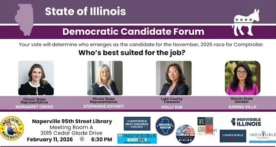 Join Indivisible Naperville's in-person State of Illinois Comptroller Forum on Wednesday, February 11 at 6:30pm at the 95th Street Library located at 3015 Cedar Glade Dr. in Naperville, IL