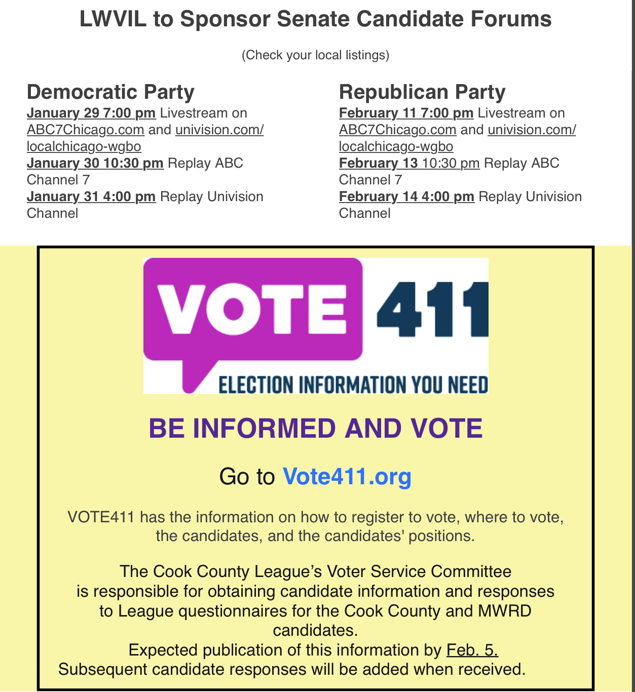The IL League of Women Voters will be broadcasting/streaming IL Senate Candidate Forums for both parties in late January and early February on the dates above. In addition, check out their Vote 411 information platform for info regarding the March 17th elections.